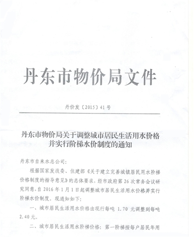 丹東市物價(jià)局關(guān)于調(diào)整城市居民生活用水價(jià)格并實(shí)行階梯水價(jià)制度的通知2017-06-15